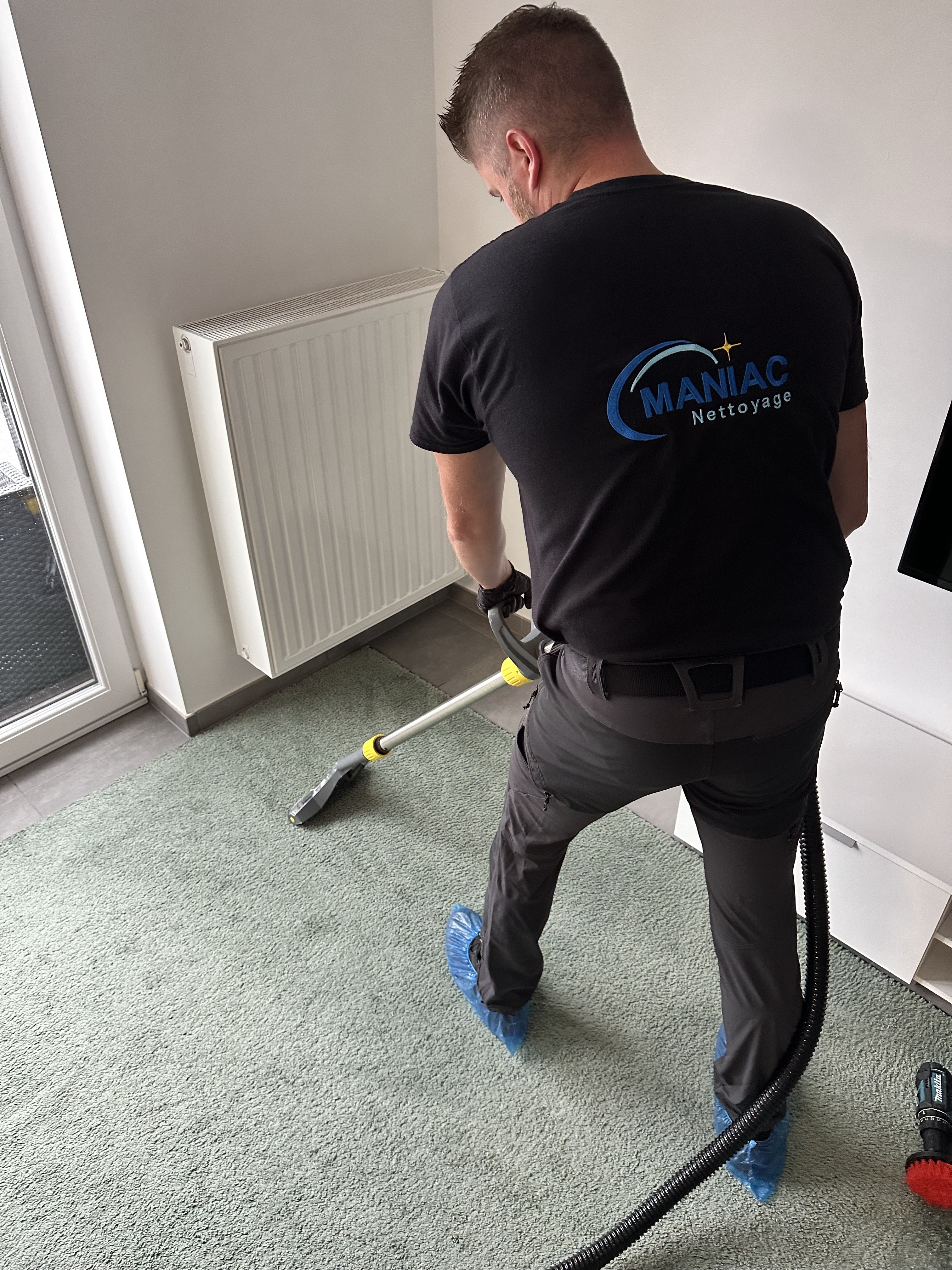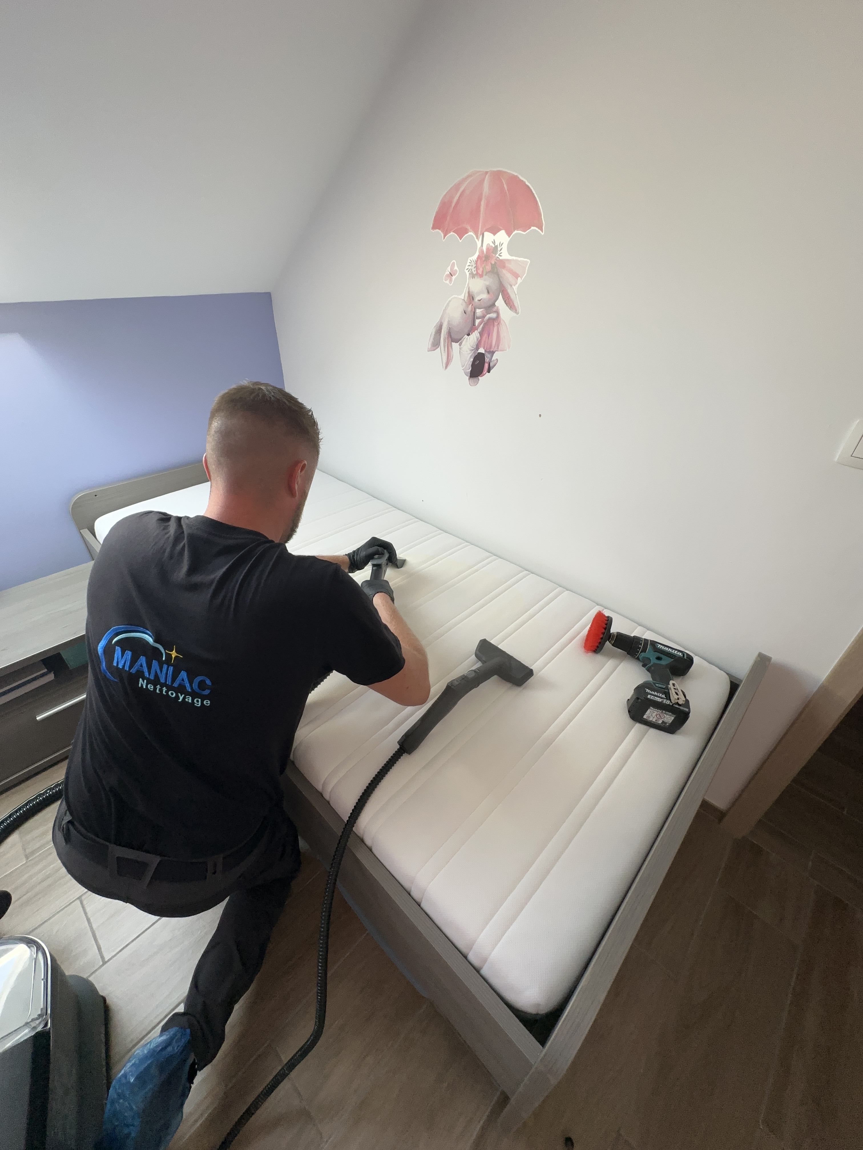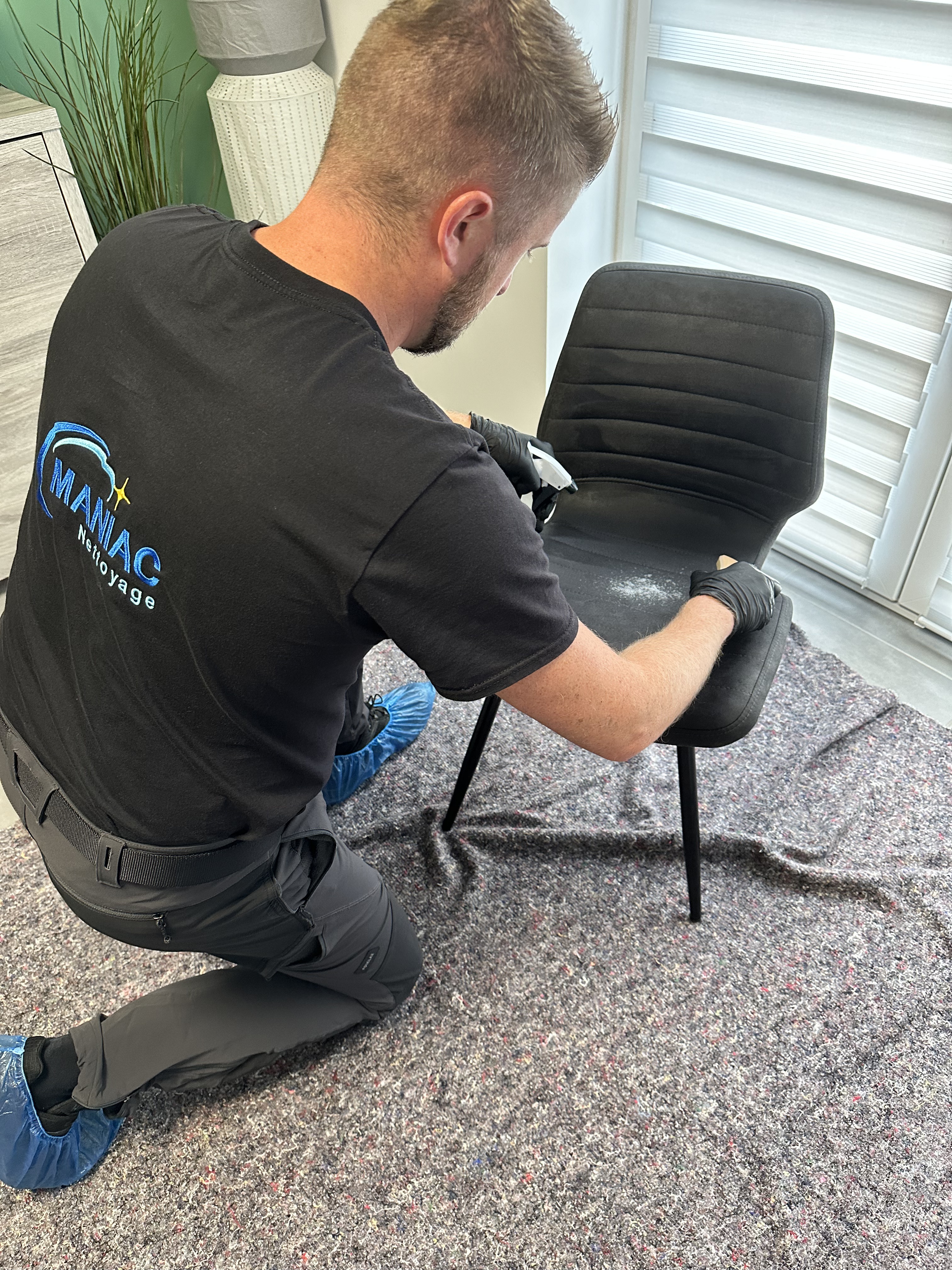 R: Dégager l’espace de travail et placer le mobilier à nettoyer au centre de la pièce. Une prise électrique ainsi qu’un point d’eau nous seront nécessaires.